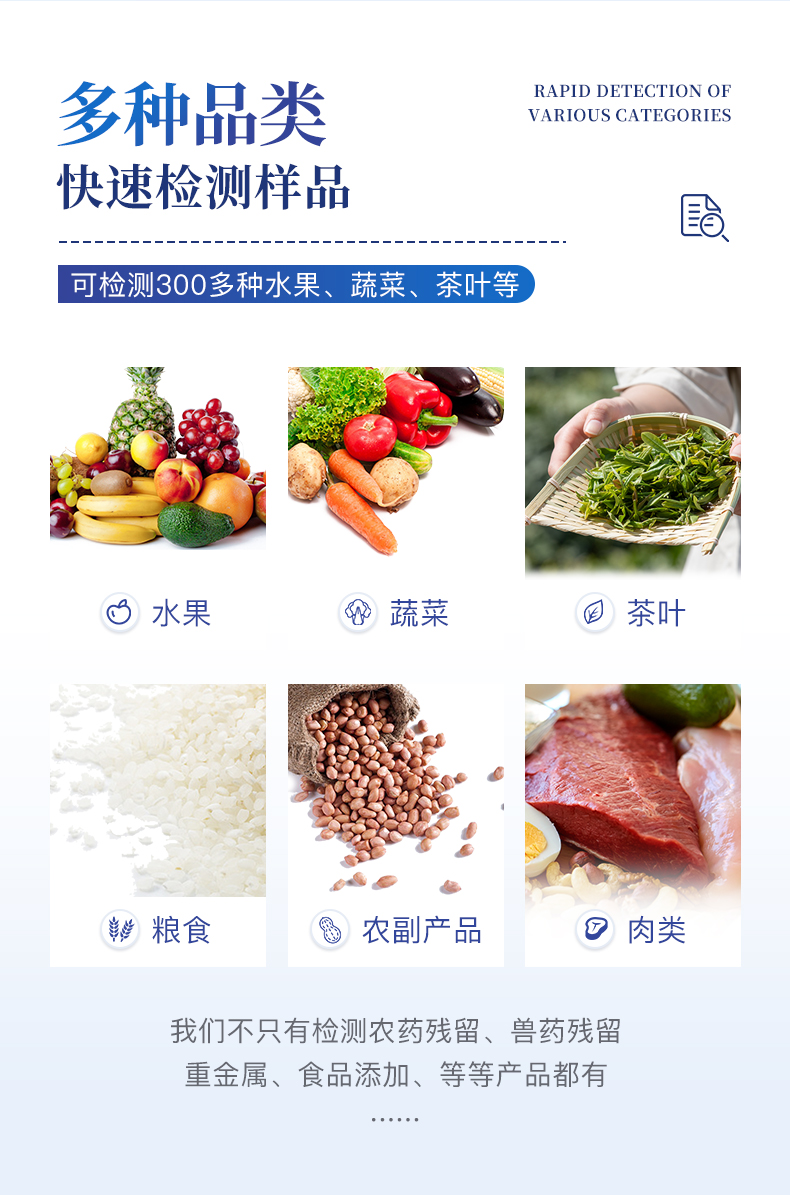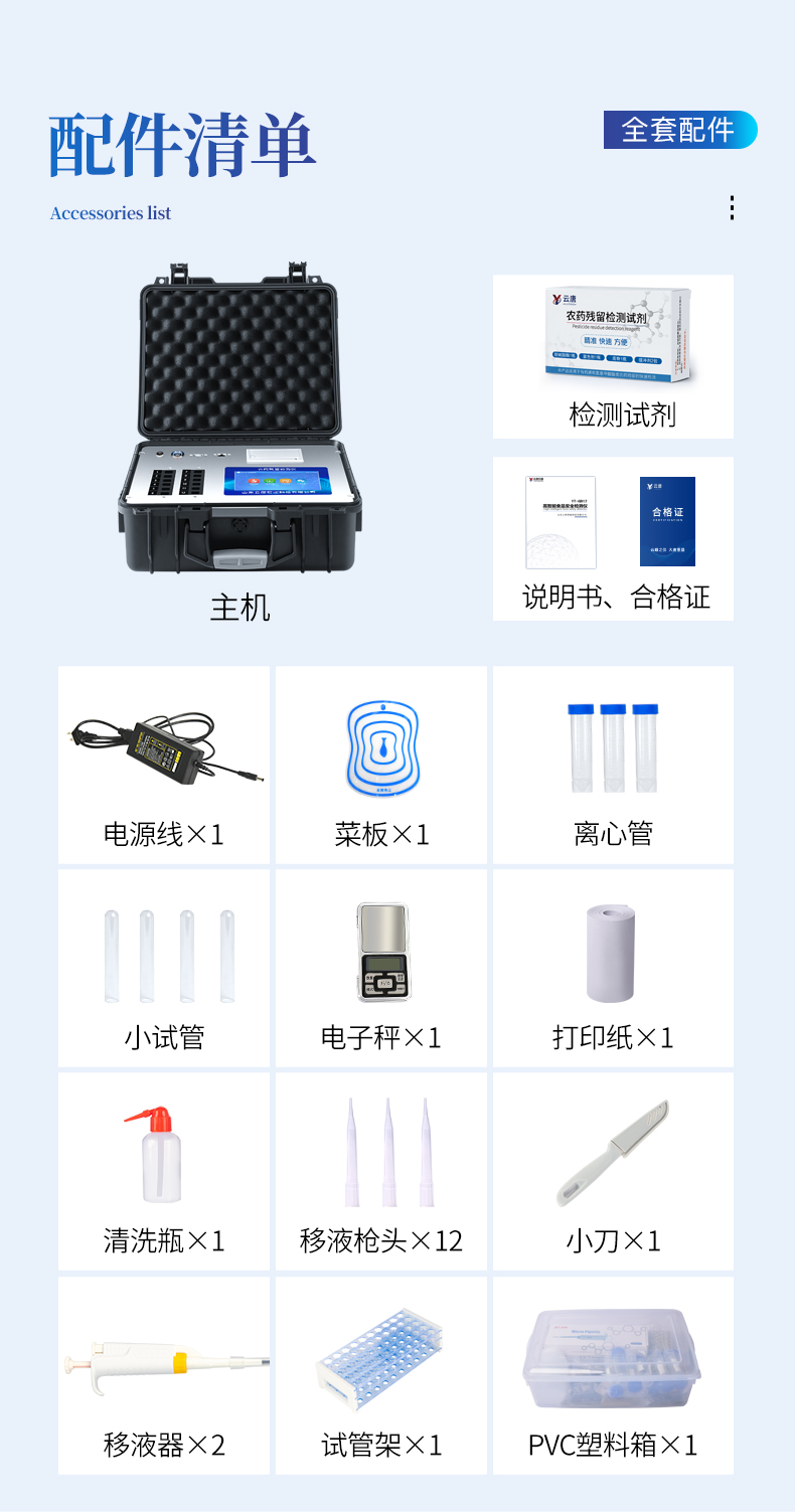 綜合農藥殘留檢測儀,除了遵循國標對有機磷和氨基甲酸酯類農藥進行檢測外,還可以針對具體農藥進行分項準確檢測,包含吡蟲啉、噻蟲嗪、多菌靈、百菌清、克百威、毒死蜱、異丙威、啶蟲脒、氟蟲腈、水胺硫磷、甲萘威、三唑磷、百草枯、甲霜靈、殺螟硫磷、百菌清-多菌靈2合1、氟蟲腈-甲萘威2合1、甲基對硫磷、乙草胺、阿維菌素、有機磷、甲草胺、涕滅威、噻菌靈、三唑酮、氯吡脲、多效唑、氯噻啉、霜霉威、噻蟲啉、辛硫磷、苯醚甲環唑、4-氯苯氧乙酸、2,4-二氯苯氧乙酸、2,4,5-三氯苯氧乙酸、6-芐基腺嘌呤、除草定、烯啶蟲胺、異菌脲、氟苯脲、腐霉利、甲氰菊酯、**氯氟氰菊酯、二甲戊靈、氟節甲基異柳磷、噠螨靈、噻蟲胺、烯酰嗎啉、嘧菌酯、氟樂靈、嘧霉胺、三唑酮/三唑醇、滅蠅胺、戊唑醇、甲拌磷、氯蟲苯甲酰胺、二嗪磷、氧樂果、甲基吡啶磷、阿滅丁、雙甲脒等眾多殺蟲劑化合物。