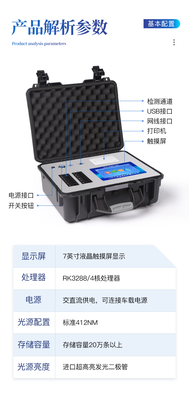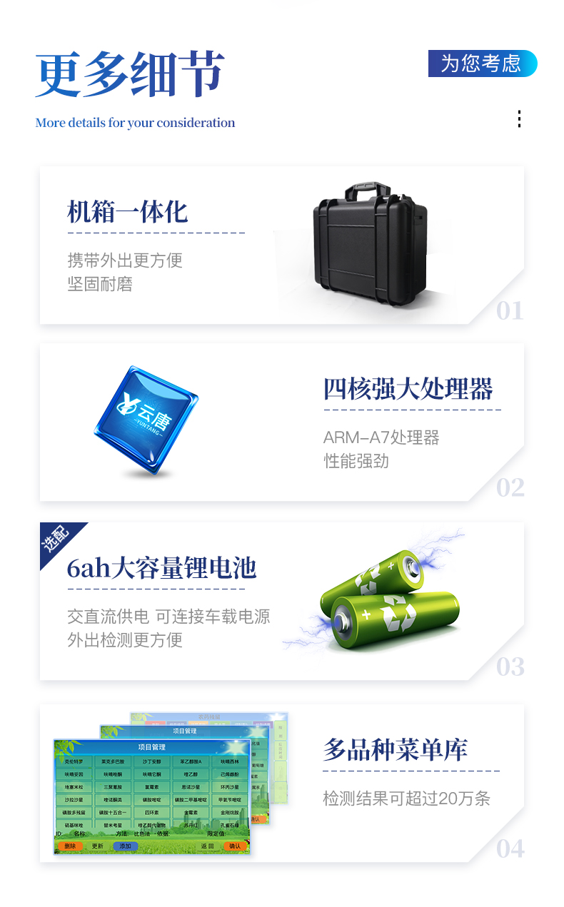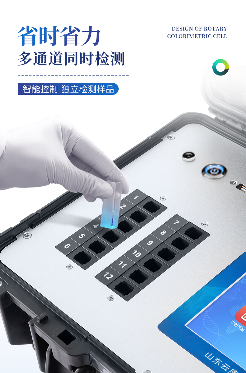 | 主控芯片采用ARM Cortex-A7,RK3288/4核處理器,主頻1.88Ghz,運轉速度更快速,穩定性更強。 | 12個檢測通道,可批量快速多樣品檢測, | 顯示方式:7英寸液晶觸摸屏顯示,人性化中文操作界面,讀數直觀、簡單。 | 交直流兩用,配有6ah大容量充電鋰電池,方便戶外流動測試,直流12V供電,可連接車載電源。 | 智能恒流穩壓,光強自動調節與校準,長時間連續工作光源無溫漂現象。 | 樣本編號自動累加。 | 數據無線上傳平臺,并可從平臺導出為Excel表格。 | 檢測結果存儲容量20萬條 | 同時支持U盤拷貝,標準USB接口,免驅動插拔。 | 檢測項目可擴充,固件可升級 | 儀器尺寸:43×35×19cm, 主機凈重:5.2kg |