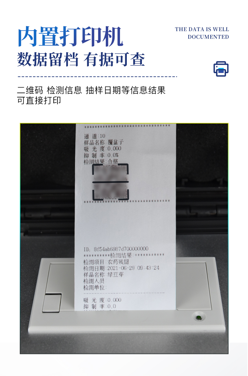 | ◆ 機箱采用工業級ABS工程塑料箱,方便攜帶,穩固耐用,便于流動測試。 | ◆ 安卓智能操作系統,采用更加**的UI交互界面,具有wifi聯網上傳、4G聯網傳輸、GPRS無線遠傳、網線連接功能,快速批量上傳數據。 | ◆ 一體化主機,包含多通道光電檢測模塊、膠體金免疫層析檢測模塊。 | ◆膠體金模塊檢測方式:軌道式自動傳輸掃描,檢測完成后自動退出檢測卡。 | ◆ CT線自動識別,無需手動調整,檢測完成自動顯示CT坐標曲線。 | ◆ 儀器具有自檢功能:具有開機自檢和調零功能,具有自動檢測重復性功能。 | ◆ 新一代高速熱敏打印機,檢測完成可自動打印或批量打印檢測報告和二維碼。 | ◆ 儀器帶有監管平臺,數據可局域網和互聯網數據上傳,檢測結果直接傳至食品安全監管平臺。進行區域食品安全監管及大數據分析處理與數據統計,檢測區域農產品安全長短期動態,達到食品安全問題預估、預警 | ◆ 內置強大的數據庫,具有多品類多種類樣品菜單功能,可靈活選擇檢測樣品,不同的檢測通道可同時檢測不同的樣品項目。也可在儀器上直接編輯錄入樣品名稱、檢測指標、送檢單位等信息并保存進樣品數據庫。 | ◆產品內置操作演示視頻,是您身邊的化驗指導專家。 | ◆ 樣品處理簡單省力,整體操作快速、安全、便捷。 | ◆ 高靈敏度,高檢測精度,高重復性精度,掃描式高精度光學傳感器。 | ◆ 結果判定線可修改,對照值標定值可保存,斷電不丟失數據。 | ◆ 兼容市場上所有的膠體金卡,使用耗材不受限制。 | ◆ 儀器具有重新校準、鎖定、恢復出廠設置功能。 |