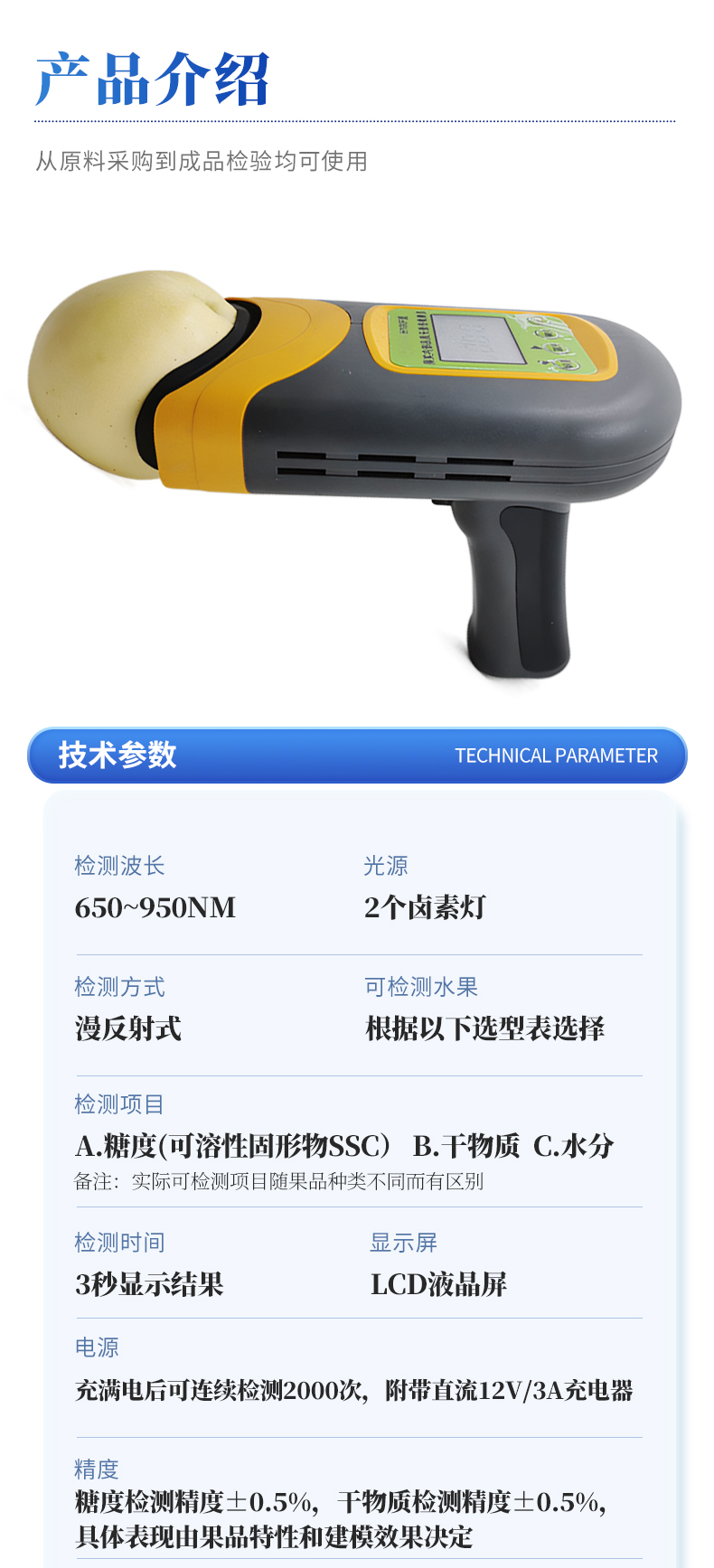 7.檢測時間:3秒顯示結果; | 8.電源:充滿電后可連續檢測2000次,附帶直流12V/3A充電器; | 9.精度:糖度檢測精度±0.5%,干物質檢測精度±0.5%,具體表現由果品特性和建模效果決定; | 10.檢測結果校正:帶有檢測值補償功能,可直接在儀器或軟件上腦操作調整;同時支持模型修正,可在配套設置軟件上直接操作; | 11.模型存儲:儀器可同時存儲多套檢測模型,檢測模型的名稱與存儲順序可由用戶通過配套軟件為儀器設定; | 12.數據傳輸:支持USB數據線傳輸,內置藍牙模塊支持無線傳輸; | 13.手機/移動終端傳輸功能:可將儀器檢測的結果實時傳輸到配套的手機APP并進行存儲,可在手機上導出存儲的所有檢測結果,儀器配套的手機APP為免費使用; | 14.提供傳輸協議,可供用戶進行二次開發,實現實時檢測、實施遠程傳輸數據的功能; | 15.標簽自動識別功能:內置RFID模塊,可自動識別帶有果樹編號的標簽卡; | 16.支持光譜信息存儲和導出; | 17.配套建模軟件:配備免費建模軟件,可由用戶自行建立檢測模型,也可由用戶導出原始光譜文件后自行建模;儀器也可導出光譜源文件,由用戶自主使用其他軟件建模; | 18.檢測結果存儲功能:儀器內部可記錄999組檢測結果,并可通過USB數據線和計算機連接,隨時導出檢測結果; | 19.操作環境:5~30℃,85%RH環境內使用 | 20.顯示屏:LCD液晶屏 | 21.電池信息:2000mA可充電鋰電池 | 22.尺寸:110×160×169mm,400g,ABS材質 | 23.附件:橡膠遮光罩,充電器,USB數據線,便攜箱,軟件(免費電子版) |