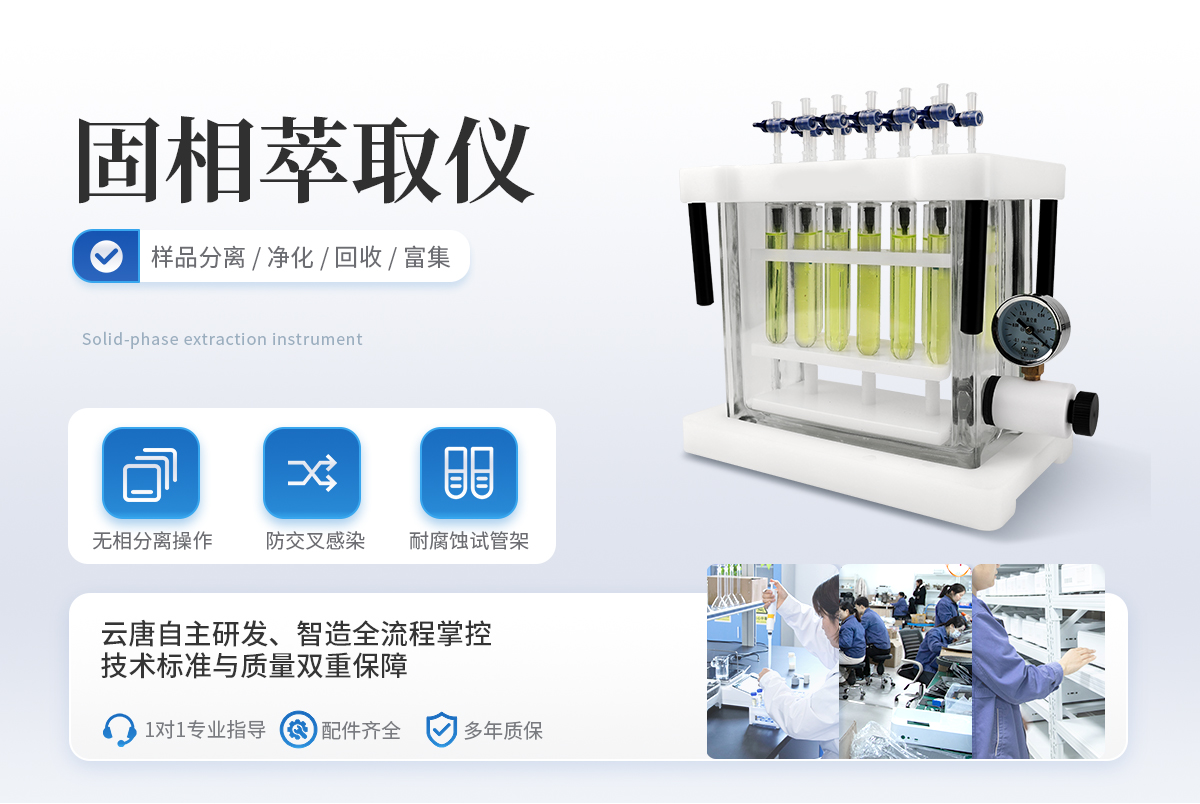 固相萃取儀 (方形)裝置是利用固體吸附劑將液體樣品中的目標(biāo)化合物吸附,與樣品的基體和干擾化合物分離,然后再用洗脫液洗脫或加熱解吸附,達(dá)到分離和富集目標(biāo)化合物的目的(即樣品 的分離, 凈化和富集), 目的在于降低樣品基質(zhì)干擾, 提高檢測靈敏度。