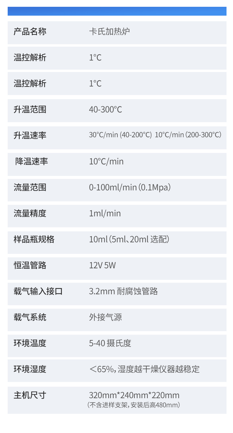 | 1. 測定原理:卡爾費休庫倫法(電量法) | 2. 測量速度:2.8mgH 2 O/min(**) | 3. 測量范圍:3μg-300mg(典型值) | 4. 測量準確度:3μg(10ug--100μg H2O) ≤0.3%(水含量>100μg H2O)(不含進樣量誤差) | 5. 測量準確度:3μg(10ug--100μg H2O) ≤0.3%(水含量>100μg H2O)(不含進樣量誤差) | 6. 測量分辨力:0.1μg H 2 O | 7. 相對含水量范圍:1ppm-100% | 8. 電解電流:0-500mA 可調節 | 9. 水分濃度分辨率:0.001ppm | 10. 濃度單位:%、ppm、mg/kg | 11. 攪拌速度:無級觸摸調節 | 12. 漂移值空白值扣除:自動扣除 | 13. 特殊功能:自動漂移補償、環境及本底水分自動扣除、故障自檢提示 | 14. 顯示及操作:彩色觸摸屏 | 15. 樣品編號:用戶可自由設定樣品編號 | 16. 存儲數據:500條 | 17. 打印功能:內置低能耗高速熱敏打印機,58毫米紙寬 | 18. 打印內容:根據用戶測量公式及測量結果顯示不同內容 | 19. 日歷/時間:當前時間、日期、檢測時間日期顯示并打印輸出 | 20. 終點指示:屏幕提示 / 打印輸出 / 聲音警告 / 終點燈指示 | 21. 使用環境:溫度 2℃-50℃,濕度?90% | 22. 功率消耗:≤50W | 23. 主機尺寸:320*220*190mm | 24. 電源電壓:220V 50HZ 150W | 25. 重量:主機凈重 4kg 包裝后 8KG | 26. 產品名稱:卡氏加熱爐 | 27. 溫控解析:1℃ | 28. 溫控解析:1℃ | 29. 升溫范圍:40-300℃ | 30. 升溫速率:30℃/min (40-200℃) 10℃/min(200-300℃) | 31. 降溫速率:10℃/min | 32. 流量范圍:0-100ml/min(0.1Mpa) | 33. 流量精度:1ml/min | 34. 樣品瓶規格:10ml(5ml、20ml 選配) | 35. 恒溫管路:12V 5W | 36. 載氣輸入接口:3.2mm 耐腐蝕管路 | 37. 載氣系統:外接氣源 | 38. 環境溫度:5-40 攝氏度 | 39. 環境濕度:<65%,濕度越干燥儀器越穩定 | 40. 主機尺寸:320mm*240mm*220mm(不含進樣支架,安裝后高480mm) |