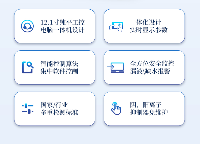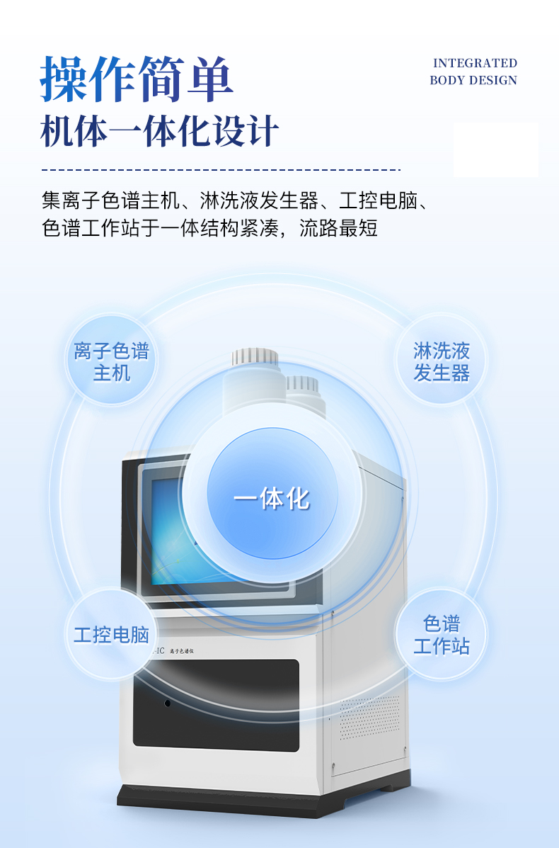 | 我們公司作為離子色譜儀器市場的新業態,一直致力于為用戶提供更快捷、優質的儀器,以保障實驗室的建設和運行。始終堅持以客戶為中心,為有檢測需求的客戶服務。物美價廉、響應迅捷、服務全面。 | 全新一代離子色譜儀,采用12.1吋純平工控電腦一體機設計(用戶不需要配電腦),實時顯示儀器運行參數和狀態;一鍵啟動電動閥進樣,一鍵完成儀器開關機、維護等操作,一鍵調閱儀器操作教程,方便快捷。 | 離子色譜儀核心零部件自主研發、自主知識產權可控。采用一體化設計,集離子色譜主機、淋洗液發生器、工控電腦、色譜工作站于一體,結構緊湊,流路*短,對流路造成的峰型擴展有很好的改善。一體化恒溫箱:色譜柱、抑制器、電導池、放大電路都處于同一恒溫系統,改善了電導檢測器的溫飄和基線噪聲。內置多處漏液報警器和缺水報警器,全方位安全監控。由PLC控制的各個部件統一到電腦顯示屏的集中軟件控制系統,操作方便,鼠標所見即所控。 |