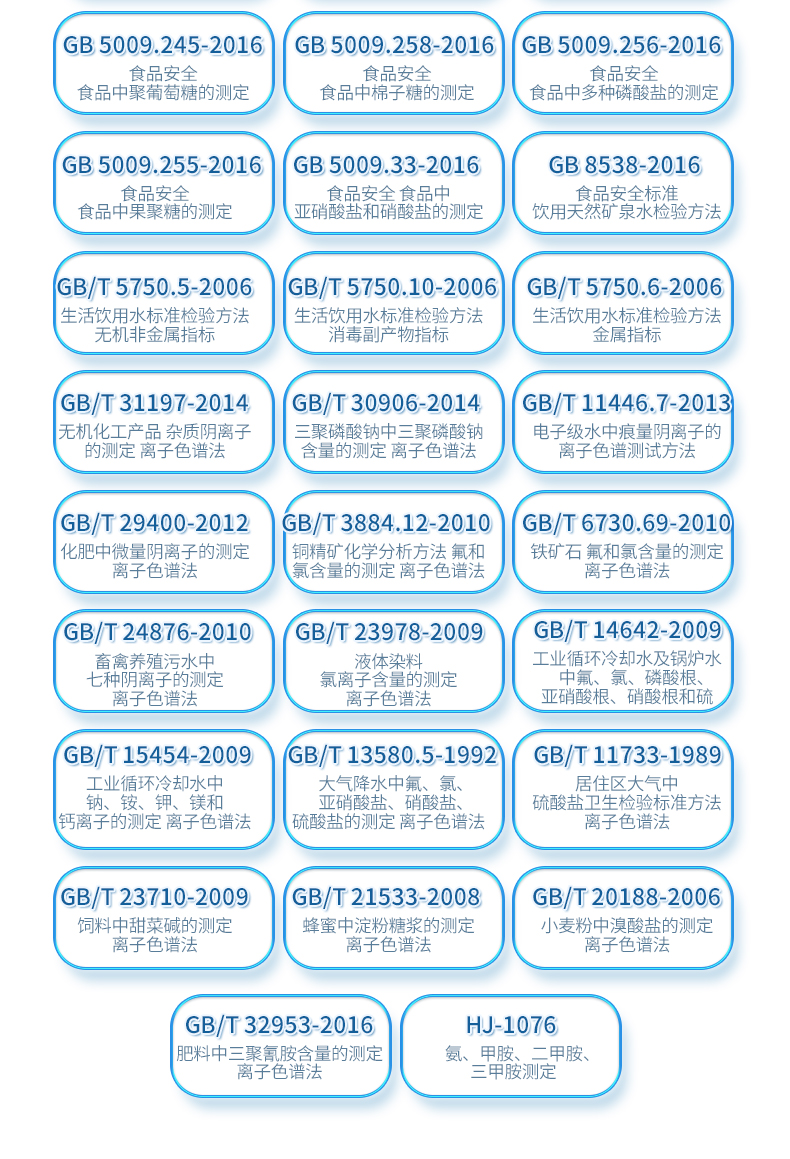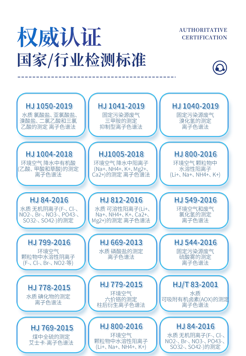 | HJ 1050-2019 水質 氯酸鹽、亞氯酸鹽、溴酸鹽、二氯乙酸和三氯乙酸的測定 離子色譜法 | HJ 1041-2019 固定污染源廢氣 三甲胺的測定 抑制型離子色譜法 | HJ 1040-2019 固定污染源廢氣 溴化氫的測定 離子色譜法 | HJ 1004-2018 環境空氣 降水中有機酸(乙酸、甲酸和草酸)的測定 離子色譜法 | HJ1005-2018 環境空氣 降水中陽離子(Na+、NH4+、K+、Mg2+、Ca2+)的測定 離子色譜法 | HJ 800-2016 環境空氣 顆粒物中水溶性陽離子(Li+、Na+、NH4+、K+) | HJ 84-2016 水質 無機陰離子(F-、Cl-、NO2-、Br-、NO3-、PO43-、SO32-、SO42-)的測定 | HJ 812-2016 水質 可溶性陽離子(Li+、Na+、NH4+、K+、Ca2+、Mg2+)的測定 離子色譜法 | HJ 549-2016 環境空氣和廢氣 氯化氫的測定 離子色譜法 | HJ 799-2016 環境空氣 顆粒物中水溶性陰離子(F-、Cl-、Br-、NO2-等) | HJ 669-2013 水質 磷酸鹽的測定 離子色譜法 | HJ 544-2016 固定污染源廢氣 硫酸霧的測定 離子色譜法 | HJ 778-2015 水質 碘化物的測定 離子色譜法 | HJ 779-2015 環境空氣 六價鉻的測定 柱后衍生離子色譜法 | HJ/T 83-2001 水質 可吸附有機鹵素(AOX)的測定 離子色譜法 | HJ 769-2015 煤中全硫的測定 艾士卡-離子色譜法 | HJ 800-2016 環境空氣 顆粒物中水溶性陽離子(Li+、Na+、NH4+、K+) | HJ 84-2016 水質 無機陰離子(F-、Cl-、NO2-、Br-、NO3-、PO43-、SO32-、SO42-)的測定 | GB 5009.245-2016 食品安全 食品中聚葡萄糖的測定 | GB 5009.258-2016 食品安全 食品中棉子糖的測定 | GB 5009.256-2016 食品安全 食品中多種磷酸鹽的測定 | GB 5009.255-2016 食品安全 食品中果聚糖的測定 | GB 5009.33-2016 食品安全 食品中亞硝酸鹽和硝酸鹽的測定 | GB 8538-2016 食品安全標準 飲用天然礦泉水檢驗方法 | GB/T 5750.5-2006 生活飲用水標準檢驗方法 無機非金屬指標 | GB/T 5750.10-2006 生活飲用水標準檢驗方法 消毒副產物指標 | GB/T 5750.6-2006 生活飲用水標準檢驗方法 金屬指標 | GB/T 31197-2014 無機化工產品 雜質陰離子的測定 離子色譜法 | GB/T 30906-2014 三聚磷酸鈉中三聚磷酸鈉含量的測定 離子色譜法 | GB/T 11446.7-2013 電子級水中痕量陰離子的離子色譜測試方法 | GB/T 29400-2012 化肥中微量陰離子的測定 離子色譜法 | GB/T 3884.12-2010 銅精礦化學分析方法 第12部分:氟和氯含量的測定 離子色譜法 | GB/T 6730.69-2010 鐵礦石 氟和氯含量的測定 離子色譜法 | GB/T 24876-2010 畜禽養殖污水中七種陰離子的測定 離子色譜法 | GB/T 23978-2009 液體染料 氯離子含量的測定 離子色譜法 | GB/T 14642-2009 工業循環冷卻水及鍋爐水中氟、氯、磷酸根、亞硝酸根、硝酸根和硫 | GB/T 15454-2009 工業循環冷卻水中鈉、銨、鉀、鎂和鈣離子的測定 離子色譜法 | GB/T 23710-2009 飼料中甜菜堿的測定 離子色譜法 | GB/T 21533-2008 蜂蜜中淀粉糖漿的測定 離子色譜法 | GB/T 20188-2006 小麥粉中溴酸鹽的測定 離子色譜法 | GB/T 13580.5-1992 大氣降水中氟、氯、亞硝酸鹽、硝酸鹽、硫酸鹽的測定 離子色譜法 | GB/T 32953-2016 肥料中三聚氰胺含量的測定 離子色譜法 | GB/T 11733-1989 居住區大氣中硫酸鹽衛生檢驗標準方法 離子色譜法 | HJ-1076 氨、甲胺、二甲胺、三甲胺測定 |