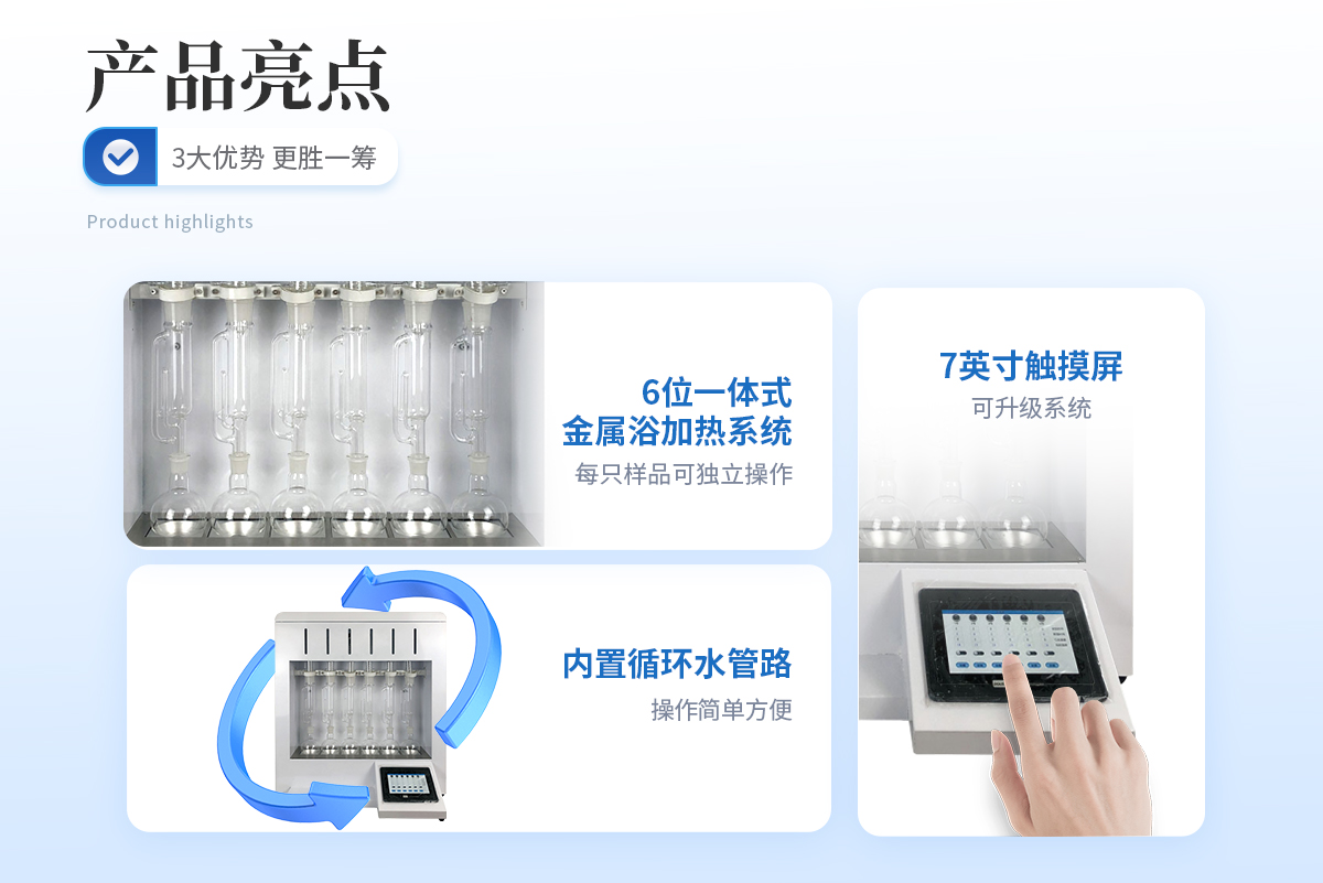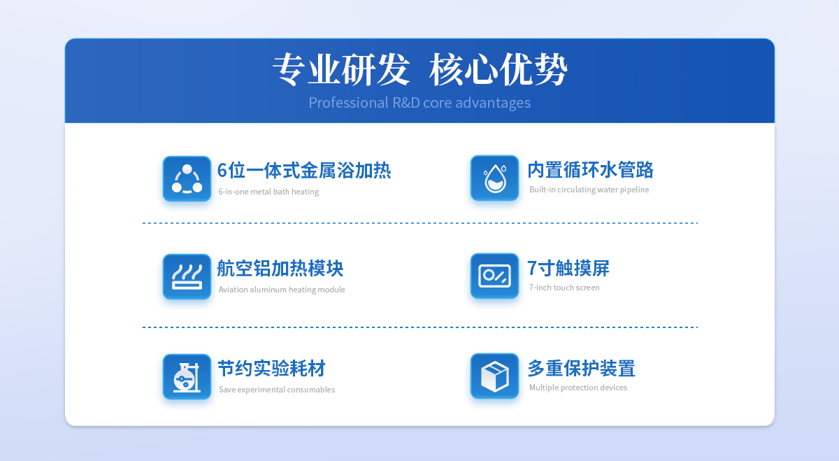 | 1.7英寸大液晶觸摸屏顯示控制,可升級程序控溫和遠程操作系統 | 2.6位一體式金屬浴加熱系統,保證每只樣品可獨立操作 | 3.航空鋁加熱模塊,升溫速度快,回流速度快,大大縮短提取時間 | 4.進口溫度傳感器,控溫精度高,均勻性好 | 5.自帶加熱萃取、淋洗溶劑回收功能,大大節約實驗耗材 | 6.內置循環水管路,操作簡單方便(可升級為內置冷卻裝置) | 7.具有過壓,過熱,漏電多重保護裝置,無需看管,保證機器長時間使用的安全性 | 8.可升級成內置冷水系統,無需外接水源。具有計時和時間控制的循環系統;冷卻水全自動控制。 |
