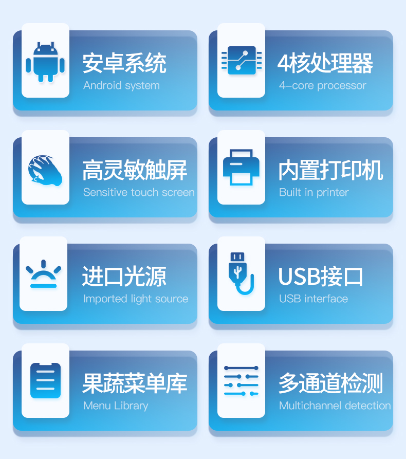 檢測項目:可快速檢測各類食品中、水中的尿素的含量,儀器預留其他項目檢測程序和端口,根據日后需求可方便的自主增加檢測項目。日后可升級為檢測,水產品,肉制品,面制品的綜合類型儀器。檢測通道:≥12個檢測通道,可以同時測試多個樣品,每個樣品由程序控制分別獨立工作,不會互相干擾。顯示方式:≥5英寸液晶觸摸屏顯示,人性化中文操作界面,讀數直觀、簡單。配備嵌入式熱敏打印機,可選擇手動打印或者自動打印,三分鐘出打印結果。光源采用進口超高亮發光二極管,高精度、穩定性強、光源可控、可以關掉不使用的光源,功耗更低。采用USB2.0接口設計,方便數據的存貯和移動,并可隨時與計算機直接相連,并且可用計算機控制儀器。實現數據查詢、瀏覽、分析、統計、打印等。智能化程度高,儀器具有自檢功能:具有開機自檢和調零功能,具有自動檢測重復性功能自動判斷樣品是否合格,檢測結果更加直觀。選配功能