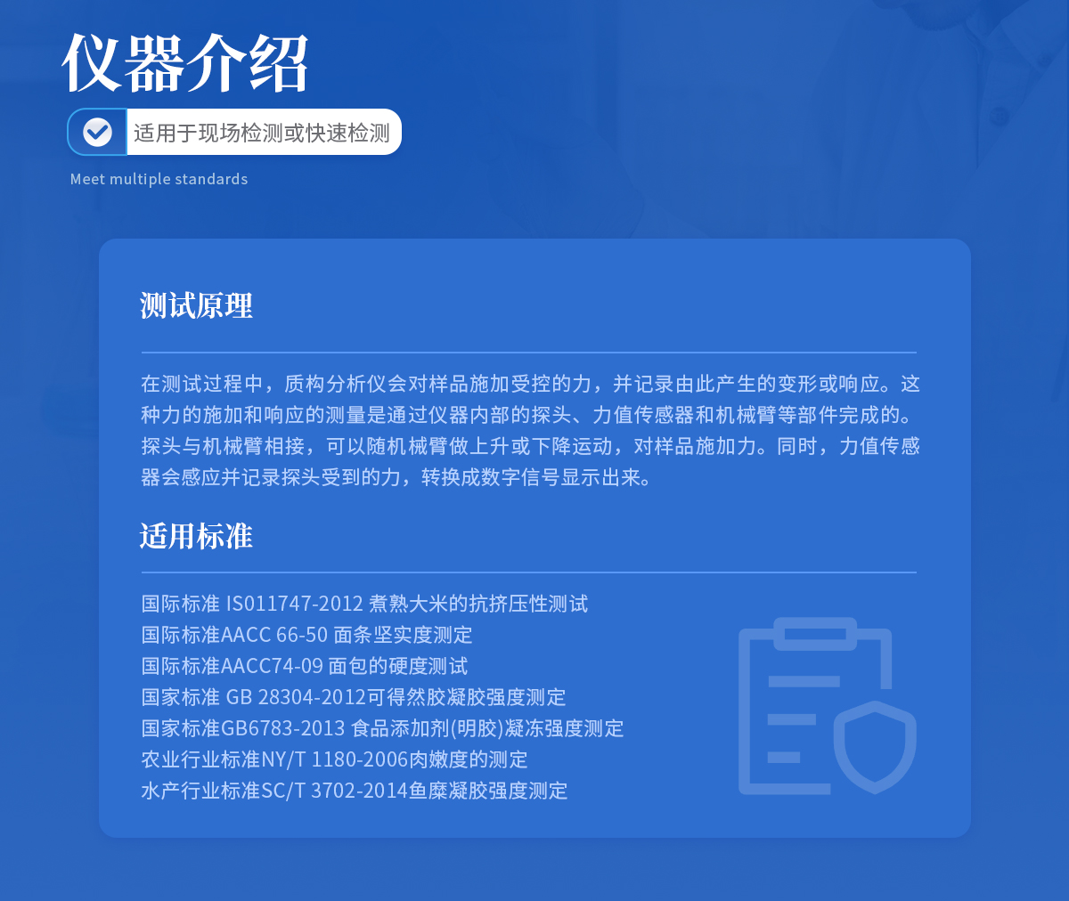 | 國(guó)際標(biāo)準(zhǔn) IS011747-2012 煮熟大米的抗擠壓性測(cè)試 | 國(guó)際標(biāo)準(zhǔn)AACC 66-50 面條堅(jiān)實(shí)度測(cè)定 | 國(guó)際標(biāo)準(zhǔn)AACC74-09 面包的硬度測(cè)試 | **** GB 28304-2012可得然膠凝膠強(qiáng)度測(cè)定 | ****GB6783-2013 食品添加劑(明膠)凝凍強(qiáng)度測(cè)定 | 農(nóng)業(yè)行業(yè)標(biāo)準(zhǔn)NY/T 1180-2006肉嫩度的測(cè)定 | 水產(chǎn)行業(yè)標(biāo)準(zhǔn)SC/T 3702-2014魚糜凝膠強(qiáng)度測(cè)定 |