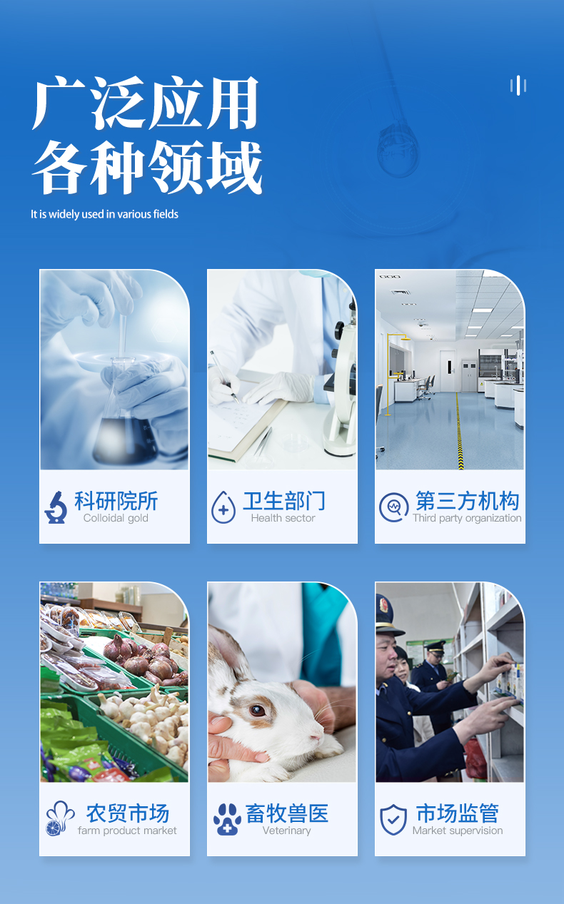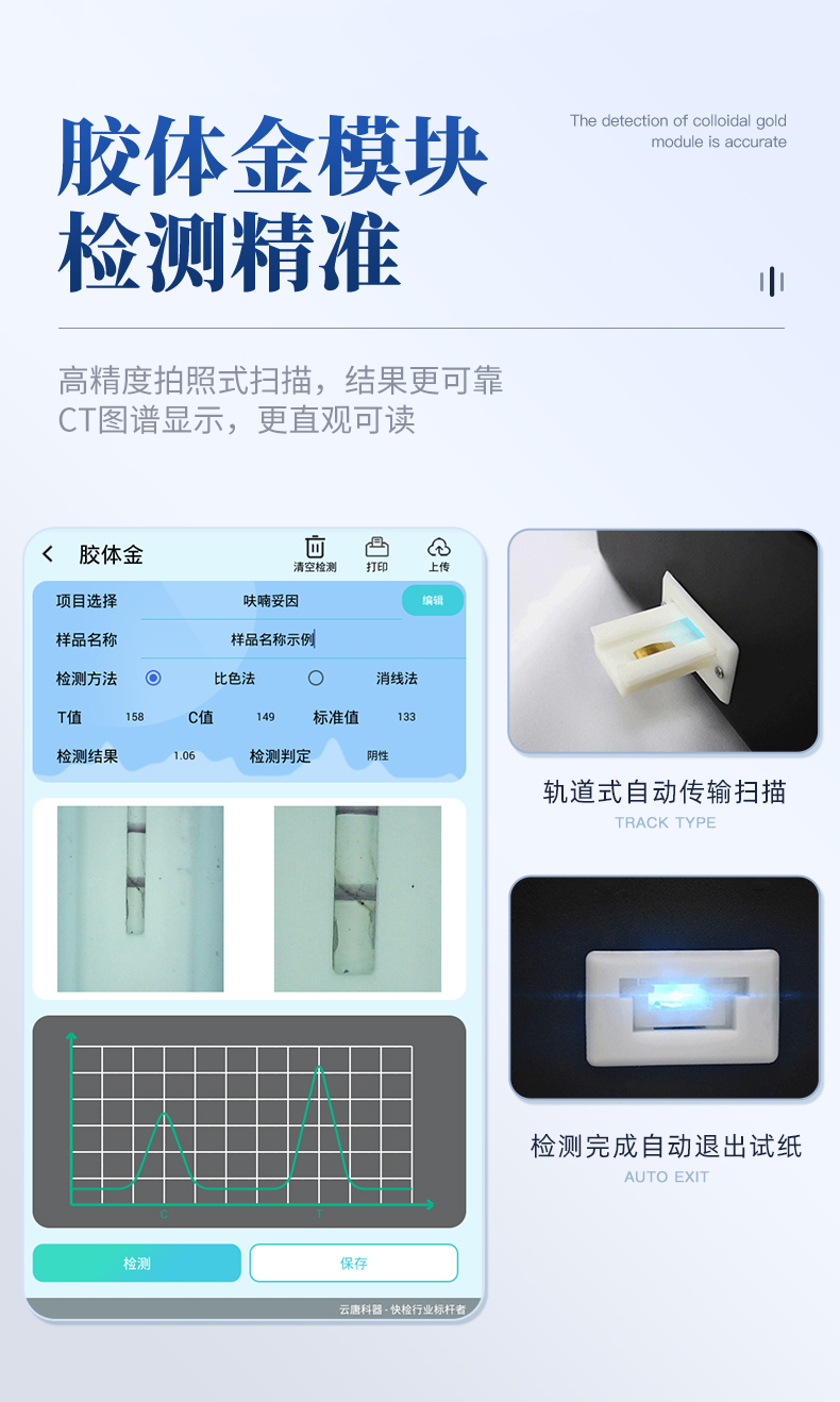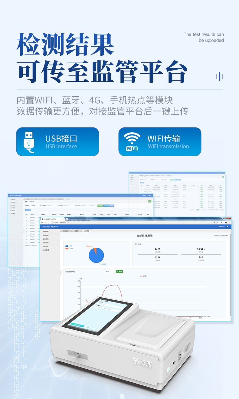 | 安卓智能操作系統(tǒng),采用更加**和人性化操作,儀器具有網(wǎng)線連接、wifi聯(lián)網(wǎng)上傳、GPRS無線遠(yuǎn)傳功能,快速上傳數(shù)據(jù)。 | 智能化程度高,儀器具有自檢功能:具有開機(jī)自檢和調(diào)零功能,具有自動(dòng)檢測(cè)重復(fù)性功能。 | 新一代高速熱敏打印機(jī),檢測(cè)完成可自動(dòng)打印檢測(cè)報(bào)告和二維碼。 | 儀器帶有監(jiān)管平臺(tái),數(shù)據(jù)可局域網(wǎng)和互聯(lián)網(wǎng)數(shù)據(jù)上傳,檢測(cè)結(jié)果直接傳至食品安全監(jiān)管平臺(tái)。進(jìn)行區(qū)域食品安全監(jiān)管及大數(shù)據(jù)分析處理與數(shù)據(jù)統(tǒng)計(jì),檢測(cè)區(qū)域食品安全長(zhǎng)短期動(dòng)態(tài),達(dá)到食品安全問題預(yù)估、預(yù)警 | 一體化便攜式快檢設(shè)備,滿足現(xiàn)場(chǎng)及流動(dòng)檢測(cè)使用需求,能夠在同一軟件下實(shí)現(xiàn)所有檢測(cè)項(xiàng)目的檢測(cè),并可通過同一窗口直觀顯示檢測(cè)結(jié)果。 | 膠體金模塊檢測(cè)方式:軌道式自動(dòng)傳輸掃描,檢測(cè)完成后自動(dòng)退出檢測(cè)卡。 | CT線自動(dòng)識(shí)別,無需手動(dòng)調(diào)整。 | 儀器具有品類多種類樣品菜單庫,可靈活選擇檢測(cè)樣品,不同的檢測(cè)通道可同時(shí)檢測(cè)不同的樣品項(xiàng)目。 | 樣品處理簡(jiǎn)單省力,整體操作快速、安全、便捷。 | 儀器具有自身保護(hù)功能,可設(shè)置用戶名及密碼,防止非工作人員操作等。 | 高靈敏度,高檢測(cè)精度,高重復(fù)性精度,掃描式高精度光學(xué)傳感器。 | 內(nèi)置強(qiáng)大的數(shù)據(jù)庫,可在儀器上直接選擇樣品名稱、檢測(cè)指標(biāo)、送檢單位等信息,也可在儀器上直接編輯錄入樣品名稱、檢測(cè)指標(biāo)、送檢單位等信息并保存進(jìn)樣品數(shù)據(jù)庫。 | 儀器具有重新校準(zhǔn)、鎖定、恢復(fù)出廠設(shè)置功能。 | 結(jié)果判定線可修改,對(duì)照值標(biāo)定值可保存,斷電不丟失數(shù)據(jù)。 | 兼容市場(chǎng)上所有的膠體金卡,使用耗材不受限制,極大增強(qiáng)用戶使用體驗(yàn)。 |