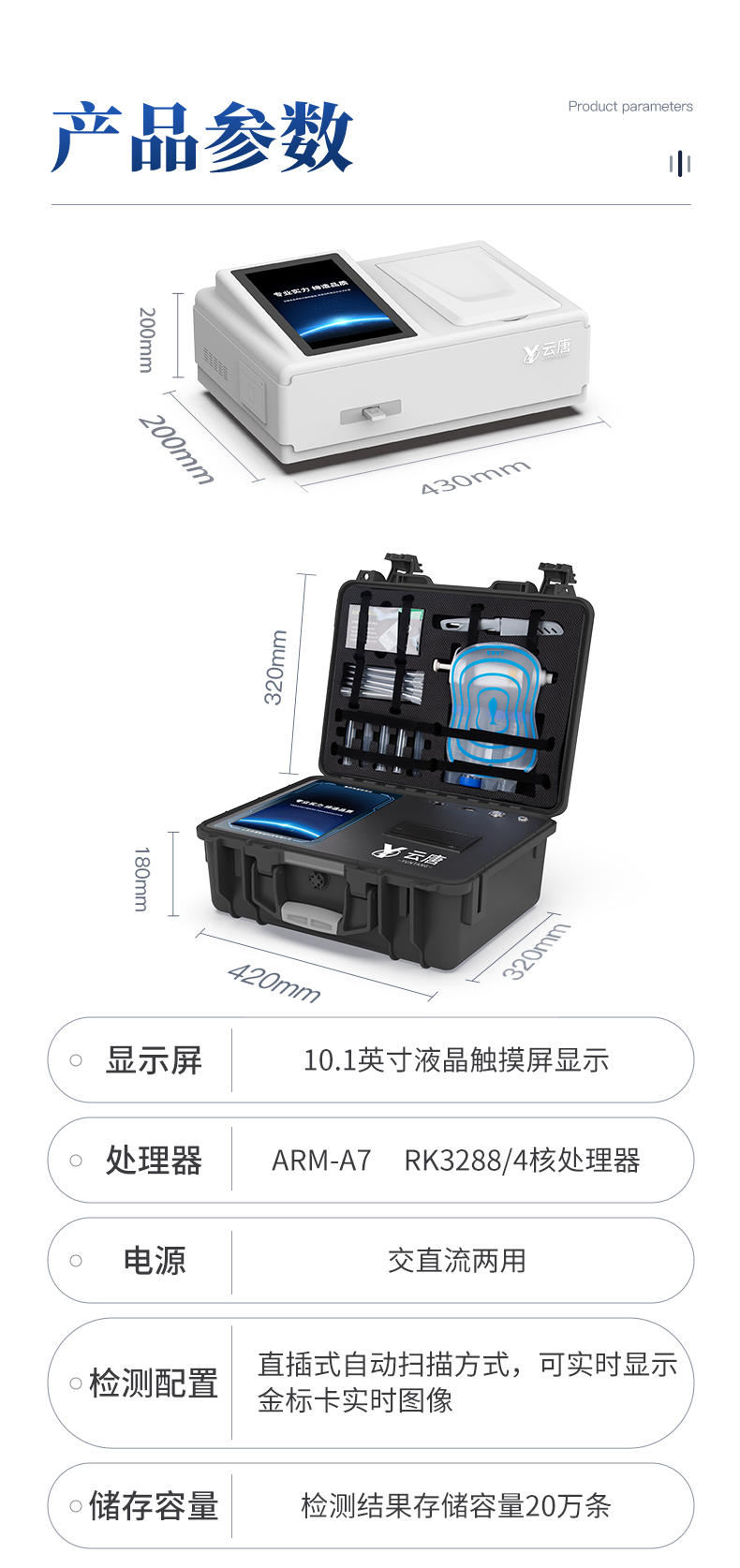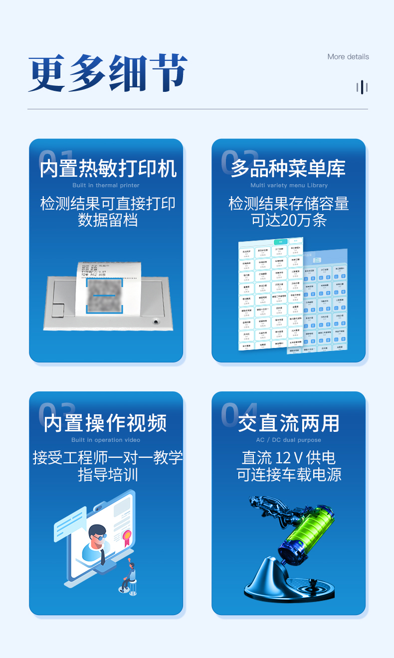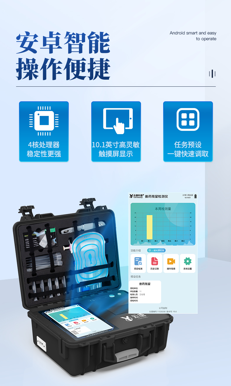 | 主控芯片采用ARM Cortex-A7,RK3288/4核處理器,主頻1.88Ghz,運(yùn)轉(zhuǎn)速度更快速,穩(wěn)定性更強(qiáng)。 | 顯示方式:7英寸液晶觸摸屏顯示,人性化中文操作界面,讀數(shù)直觀、簡(jiǎn)單。 | 交直流兩用,直流12V供電,可連接車載電源,可配6ah大容量充電鋰電池,方便戶外流動(dòng)測(cè)試。 | 光源亮度自動(dòng)調(diào)節(jié)與校準(zhǔn) | 智能恒流穩(wěn)壓,光強(qiáng)自動(dòng)校準(zhǔn),長(zhǎng)時(shí)間連續(xù)工作光源無溫漂現(xiàn)象。。 | 內(nèi)置新國(guó)家限量標(biāo)準(zhǔn),與所測(cè)結(jié)果進(jìn)行現(xiàn)場(chǎng)比對(duì),并持續(xù)更新標(biāo)準(zhǔn)。 | 不間斷進(jìn)樣,連續(xù)檢測(cè) | 樣本編號(hào)自動(dòng)累加。 | 檢測(cè)項(xiàng)目可擴(kuò)充。 | 檢測(cè)結(jié)果可批量打印,批量上傳。 | 檢測(cè)結(jié)果為Excel表格,連接電腦即可拷貝。 | 檢測(cè)結(jié)果存儲(chǔ)容量20萬條 | 支持U盤存儲(chǔ),標(biāo)準(zhǔn)USB接口,免驅(qū)動(dòng)安裝。 | 固件可升級(jí) |