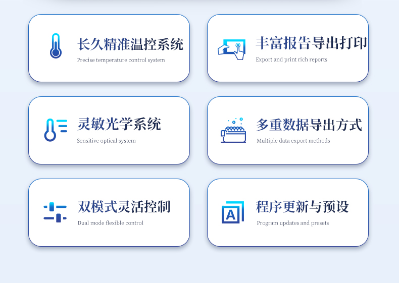 | 1.采用高規格鋁合金樣品槽,熱導性好,耐腐蝕抗氧化,Peltier加熱控溫,全面的密封設計。無論是樣品溶液還是冷凝水,都不會滲漏到樣品槽下面的帕爾帖控溫元件以及其他電子元件,可有效延長儀器的使用壽命。 | 2.采用高精度PT1000溫度傳感器,控溫精度達到0.01℃,充分保證控溫的準確度。 | 3.樣品通量:0.2ml單管、0.2ml八聯管。 | 4.開放的試劑耗材系統:可以選任何品牌的試劑,適用于標準的8聯管或0.2ml PCR單管 | 5.采用藍色、綠色、紅色和黃色四個高強度寬光譜長壽命LED固態光源,確保在整個光譜檢測范圍內都有很強的光強,提高檢測靈敏度,而且不發熱,使用壽命長,終身免維護。 | 6.高靈敏度檢測器:采用日本進口的高靈敏度的光電倍增管,檢測靈敏度更高。 | 7.無需光路校正:掃描系統能確保每孔的信號激發和檢測光程都完全一致,無需光路校正,因此無需額外占用一個校正通道,可以實現真正的四通道基因檢測。★ | 8.通道數:配置4通道。 | 9.通道串擾:采用高精度窄波帶濾光片,極大程度減少通道串擾,軟件也可以修正串擾參數。 | 10.檢測靈敏度:能檢測到單拷貝DNA模板,能清晰區分1000拷貝和2000拷貝的質粒DNA | 11.線性檢測范圍:10個數量級★ | 12.支持常用熒光染料和探針檢測方法,如SYBR Green I,Eva Green,Taqman,FRET,Molecular Beacons,Scorpions,Amplifluor等 | 13.模塊溫度范圍:4-99℃ | 14.操控模式:系統屏幕自帶的PCR操作系統或Windows電腦★ | 15.接口:電腦USB連接 | 16.工作噪音:靜音技術,運行時**的工作噪音不超過60 dB | 17.操作分析軟件 | 17.1可以在運行程序后在定義樣品孔,節省實驗時間 | 17.2運行程序時可以同時打開其他實驗數據結果進行查閱分析 | 17.3軟件自動計算基線范圍和自動設置閾值線,給用戶提供可靠準確的數據結果 | 17.4實驗程序設置信息和檢測結果可直接打印成實驗報告,支持XLS,CSV,WORD等多種文件格式和數據樣式導出★ | 17.5同一批實驗的結果可以分組進行獨立的數據分析,*多可分成2個組 | 17.6提供中英文軟件界面。★ | 17.7軟件可以無限制安裝在多臺電腦上,無需付費購買使用權,終身可免費升級。 |
