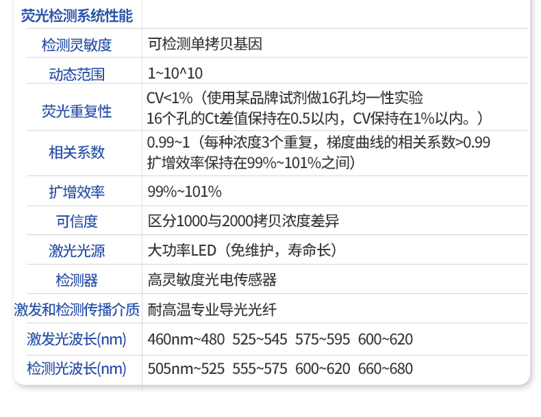 | 基本性能 | 外形尺寸:270*352*195 (mm) | 重量:7.1kg | 電源:220V | 功率:**工作功率300w | 操作系統:自帶Android操作系統 | 外接電腦:外接windows電腦(win7系統以上) | 系統語言:中英文實時切換 | 通信接口:方形USB | 操作環境參數 | 操作環境溫度:18~35℃ | 操作環境相對濕度:0%~85% | 運輸及儲存溫度:-20~55℃ | 運輸及儲存相對濕度:0%~85% | 系統性能 | 樣品容量:16孔*0.2ml | 樣品容積:15~100ul | 適用耗材:0.2ml單管、8×0.2ml排管 | 控溫范圍:4~99℃ | 熱蓋溫度:30℃-108℃(默認105℃,熱蓋溫度可調) | 溫控方式:高性能進口半導體 | 梯度控溫:3模塊梯度控溫,**溫差支持35℃ | 升溫速率:4.5℃/s(MAX) | 降溫速率:3.4℃/s(MAX) | 控溫精度:±0.1℃ | 溫度均一性:±0.25℃ | 溫度準確度:±0.1℃ | 操作功能:預設項目和分析參數,操作簡單方便 | 報告:支持報告自定義模塊,16孔分項目打印 | 分析功能:具多重qPCR數據分析功能,可同時檢測4個檢測通道 | 斷電保護:可以一鍵重啟中斷的實驗 | 儀器信息:擁有故障記錄,分析,提示的功能,更方便遠程解決問題 | 分析算法:擴增曲線,標準曲線定量、熔解曲線,基因分型(SNP),相對定量 | 支持HRM檢測:支持 | 數據導出:可將實驗結果以圖形和表格的形式直接導出;詳細的數據報告內容包括實驗條件,數據坐標和表格,數據分析參數。 | 數據格式:XLS, CSV, DOCX,PDF | TouchDown功能:支持時間和溫度遞增遞減模式 | 熒光檢測系統性能 | 檢測靈敏度:可檢測單拷貝基因 | 動態范圍:1~10^10 | 熒光重復性:CV<1%(使用某品牌試劑做16孔均一性實驗,16個孔的ct差值保持在0.5以內,cv保持在1%以內。)> | 相關系數:0.99~1(每種濃度3個重復,梯度曲線的相關系數>0.99,擴增效率保持在99%~101%之間) | 擴增效率:99%~101% | 可信度:區分1000與2000拷貝濃度差異 | 激光光源:大功率LED(免維護,壽命長) | 檢測器:高靈敏度光電傳感器 | 激發和檢測傳播介質:耐高溫專業導光光纖 | 激發光波長:460nm~480nm , 525nm~545nm, 575nm~595nm ,600nm~620nm | 檢測光波長:505nm~525nm , 555nm~575nm , 600nm~620nm , 660nm~680nm |